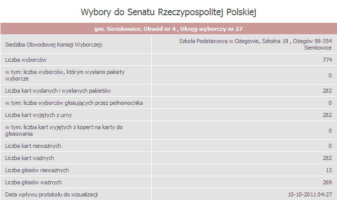 9 października 2011 roku odbyły się wybory parlamentarne, w których po raz kolejny wybieraliśmy naszych przedstawicieli do Sejmu i Senatu. Głosowaliśmy od godziny 7:00 do 21:00 w siedzibie Obwodowej Komisji Wyborczej w budynku Szkoły Podstawowej w Ożegowie.